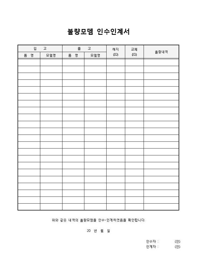 9,000원/월불량모뎀 인수인계서입니다. 입고, 출고, 해지, 교체, 불량내역 등으로 구성되어 있습니다. 불량모뎀에 대해서 입고와 출고를 작성하고 인수 인계서로 작성하여 사용할 수 있습니다.