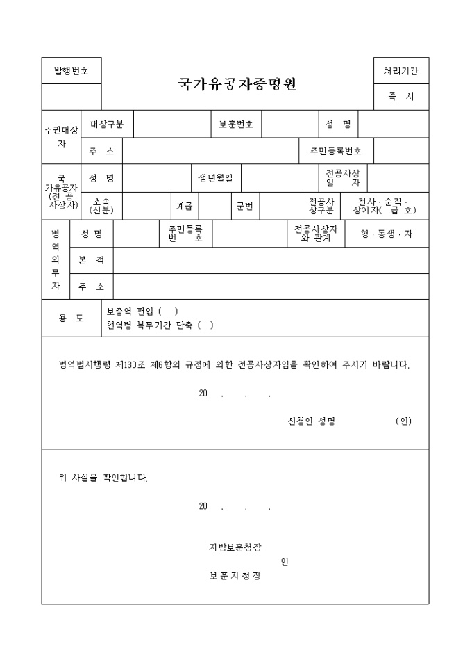 9,000원/월국가유공자 증명원 양식입니다. 병역법시행령 제130조 제6항의 규정에 의한 전공사상자임을 확인받고자 할 때 쓰이는 양식지입니다.