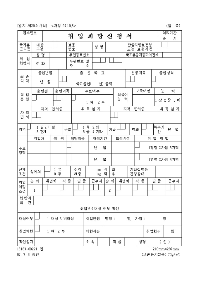 9,000원/월취업 희망신청서 양식입니다. 국가유공자등예우및지원에관한법률시행령 제50조제1항의 규정에 의하여 취업을 희망할 경우 보훈청에 제출하는 신청서 양식입니다.