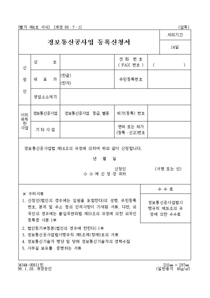 9,000원/월[별지 제4호 서식] 정보통신공사업법 제14조의 규정에 의하여 정보통신 공사업의 등록을 신청할 때 사용하는 양식입니다.