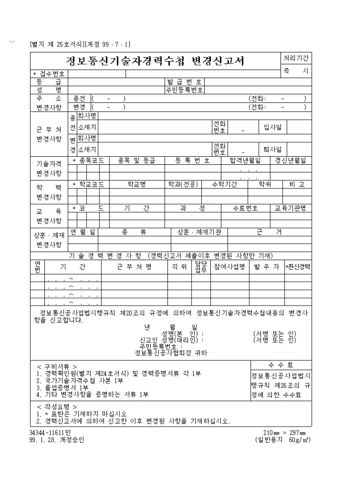 9,000원/월[별지 제 25호서식] 정보통신공사업법시행규칙 제20조의 규정에 의하여 정보통신기술자경력수첩 내용의 변경사항을 신고할 때 사용하는 양식입니다.