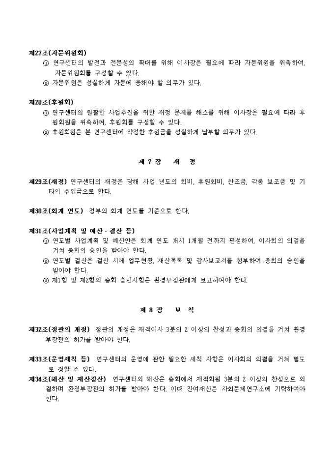 9,000원/월사단법인정관 예제 양식입니다. 제 1 장 총 칙 제1조(명칭) 본 연구센터는 사단법인 OOOO연구센터, 이하 연구센터라 한다.)라 칭한다. 제2조(소재지) 연구센터의 주 소재지는 경상남도 진주시에 둔다. ....