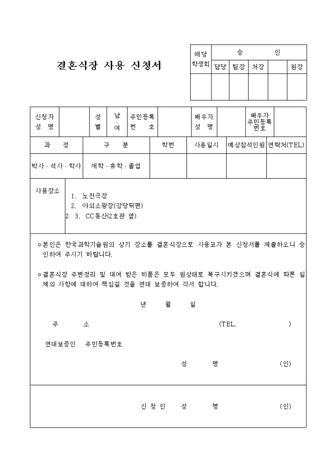 9,000원/월한국과학기술원의 장소를 결혼식장으로 사용코자 할때 사용하는 양식입니다.