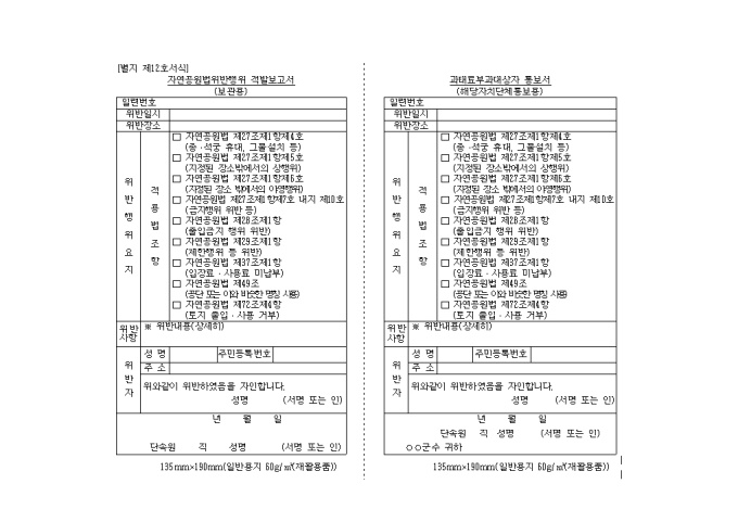 9,000원/월자연공원법 위반 행위 적발보고서 양식입니다. 1. 자연공원법 위반행위 적발보고서 (보관용) 2. 과태료 부과 대상자 통보서 (해당자치단체 통보용)
