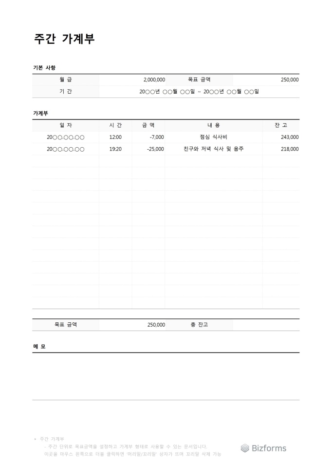주간 가계부입니다. 주간 단위로 사용할 수 있는 가계부로 목표금액을 설정하고 그 금액안에 사용할 수 있도록 도움을 줄 수 있는 문서입니다.