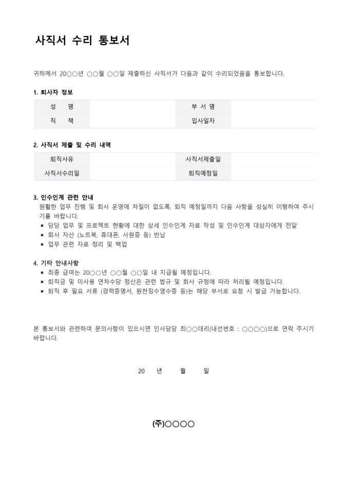 사직서 수리 통보서 서식입니다. 사직서 수리 통보서 서식은 퇴직 처리 절차를 명확히 하고, 사직일, 인수인계 관련 안내 등 필수 정보를 담아 직원과 회사 간의 오해를 방지하는 데 활용됩니다. 이를 통해 법적 분쟁의 소지를 줄이고 원활한 퇴직 절차를 진행할 수 있습니다.