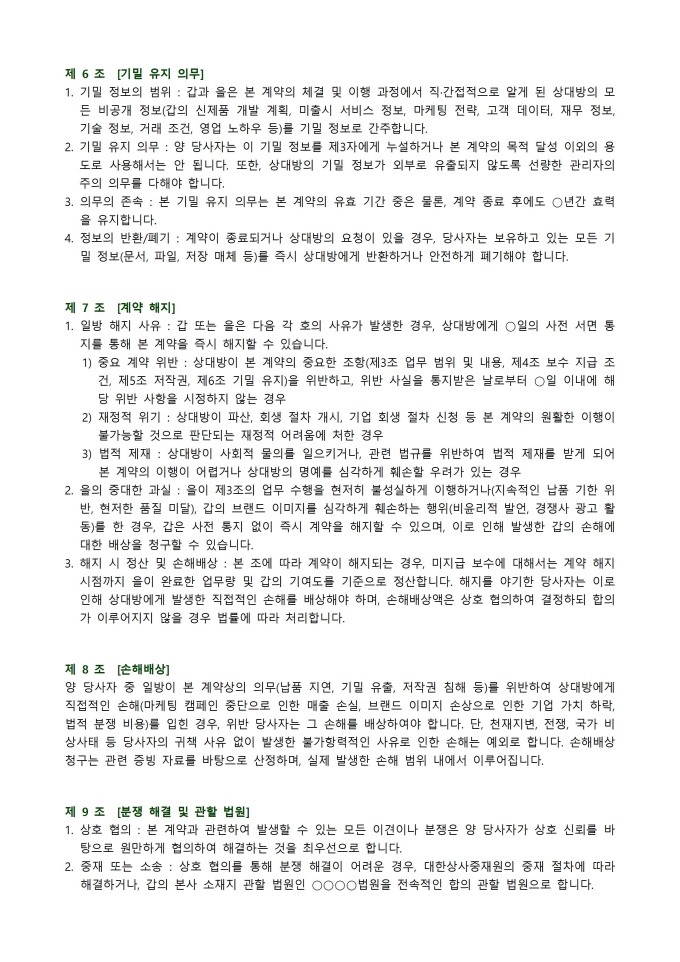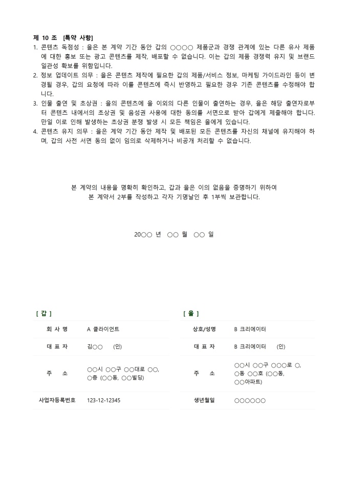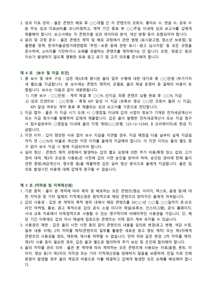 계약서 (크리에이터) 서식입니다. 계약서 (크리에이터) 서식은 창작자와 의뢰인 간의 협력 관계를 명확히 규정하고 상호 권리와 의무를 보호하기 위해 사용됩니다. 이는 콘텐츠 제작 범위, 지식재산권 소유 및 활용, 수익 배분 방식, 계약 기간 및 해지 조건 등 핵심 내용을 명시하여 분쟁을 예방합니다. 본 서식은 창작 활동의 법적 안정성을 확보하고 투명한 파트너십을 구축하는 데 필수적인 문서입니다.