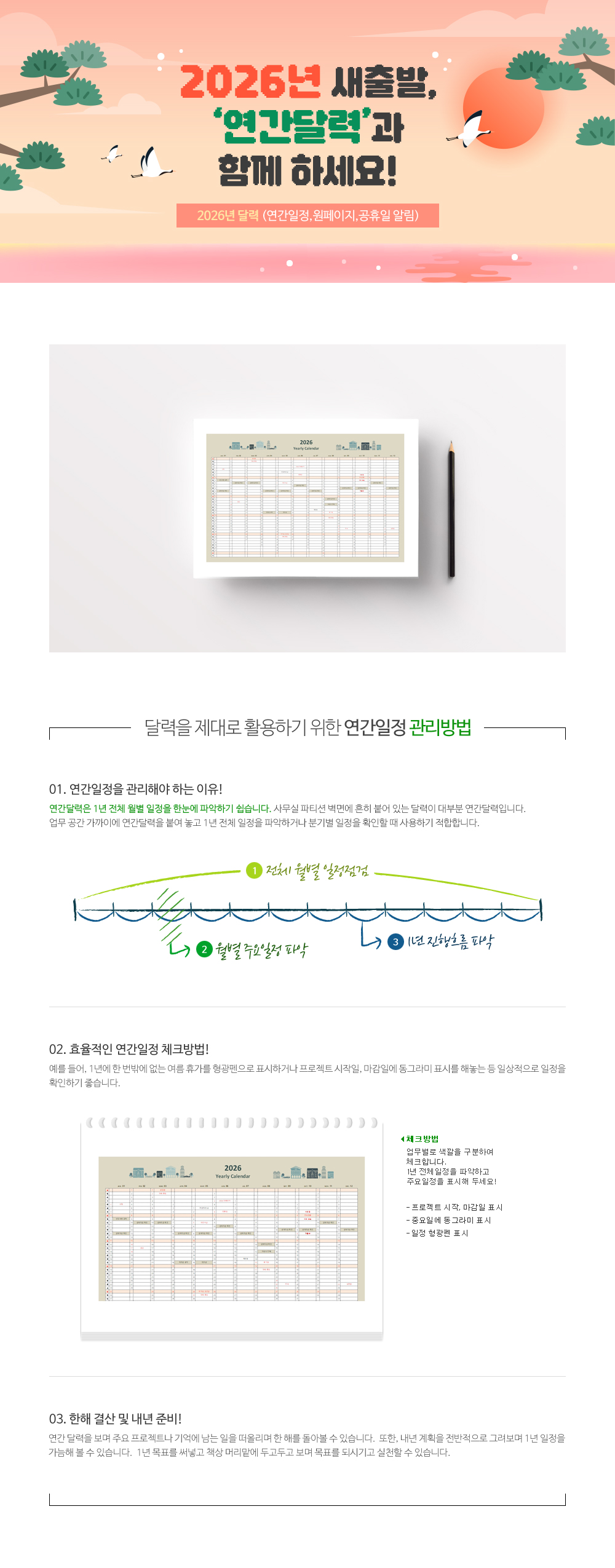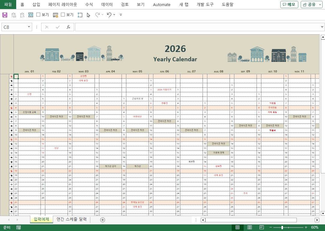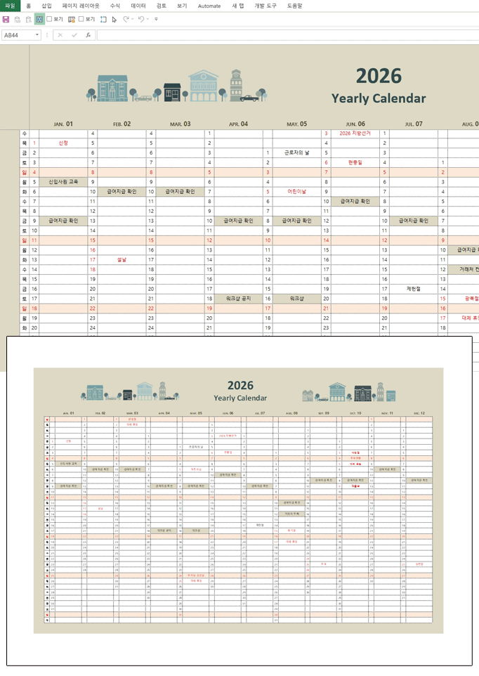 2026년 달력(연간일정,원페이지,스케줄관리) 서식입니다. 2026년 엑셀 달력 서식은 전체 연간 일정을 한 페이지에 압축하여 효율적인 시각적 관리를 가능하게 합니다. 이 서식은 사용자가 개인의 연간 스케줄을 손쉽게 입력하고 관리할 수 있도록 설계되어, 중요한 약속이나 기한을 놓치지 않도록 돕는 실용적인 스케줄 관리 도구입니다. 복잡한 기능 없이 오직 깔끔한 일정 관리에 최적화되어 있습니다.