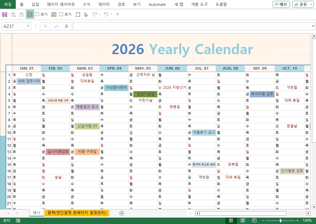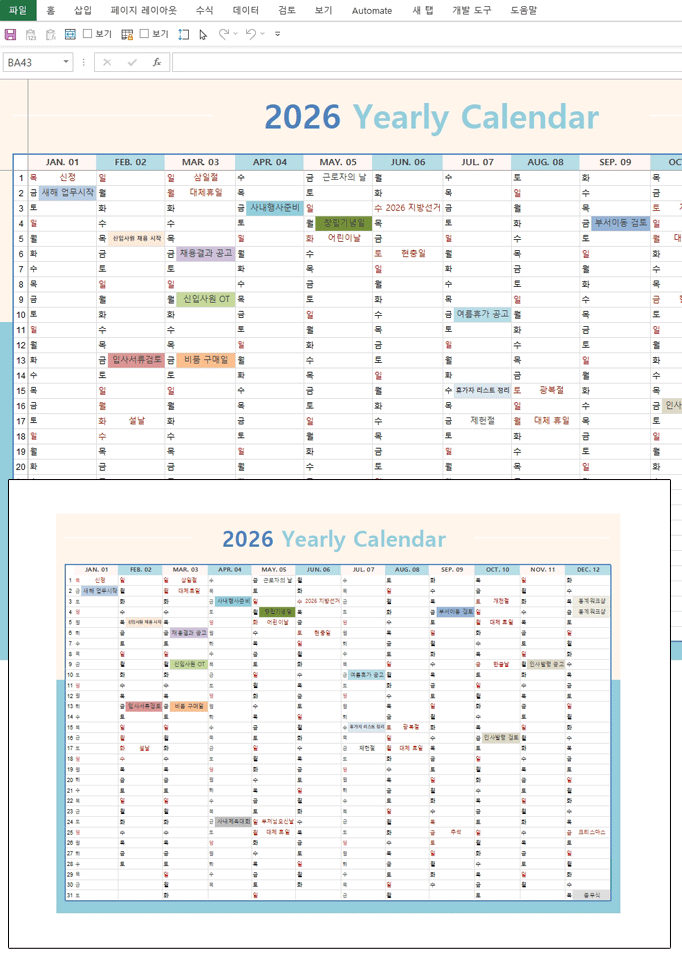 2026년 달력(연간일정,원페이지,일정관리) 서식입니다. 2026년 엑셀 달력 서식은 전체 연간 일정을 한 페이지에 담아 효율적인 시각적 관리를 가능하게 합니다. 이 서식은 사용자가 개인의 스케줄을 손쉽게 입력하고 관리할 수 있도록 설계되어, 중요한 약속이나 기한을 놓치지 않도록 돕는 실용적인 일정 관리 도구입니다. 복잡한 기능 없이 오직 깔끔한 일정 관리에 최적화된 서식입니다.