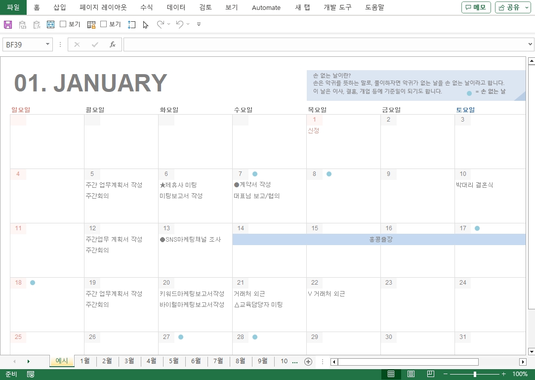 2026년 달력(월별일정,손없는날,이사하기좋은날) 서식입니다. 2026년 엑셀 달력 서식은 월별 일정을 체계적으로 관리할 수 있을 뿐만 아니라, 이사하기 좋은 날인 '손없는 날' 정보를 함께 제공합니다. 개인 일정과 더불어 특별한 의미를 지닌 날짜를 한눈에 파악할 수 있는 유용한 달력 서식입니다.