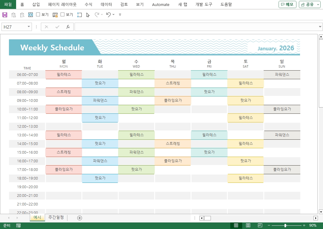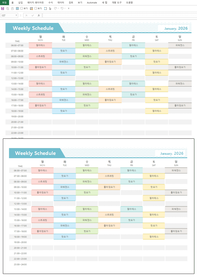 2026년 달력(주간일정,일일스케줄관리) 서식입니다. 2026년 엑셀 달력 서식은 한 주간의 전체적인 흐름과 함께 매일의 세부적인 일정을 동시에 관리할 수 있도록 설계되었습니다. 주간 계획을 바탕으로 각 요일별 해야 할 일과 중요한 약속을 빠짐없이 기록하며, 일상 속 중요한 목표들을 효율적으로 달성할 수 있도록 돕습니다.