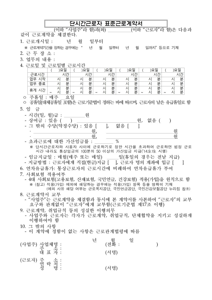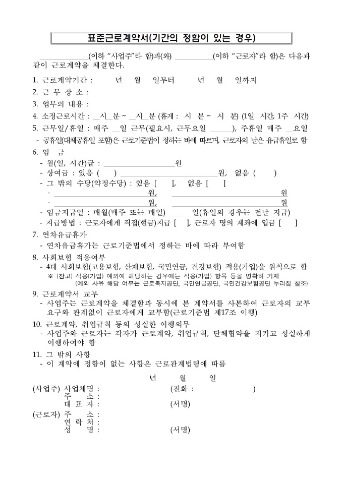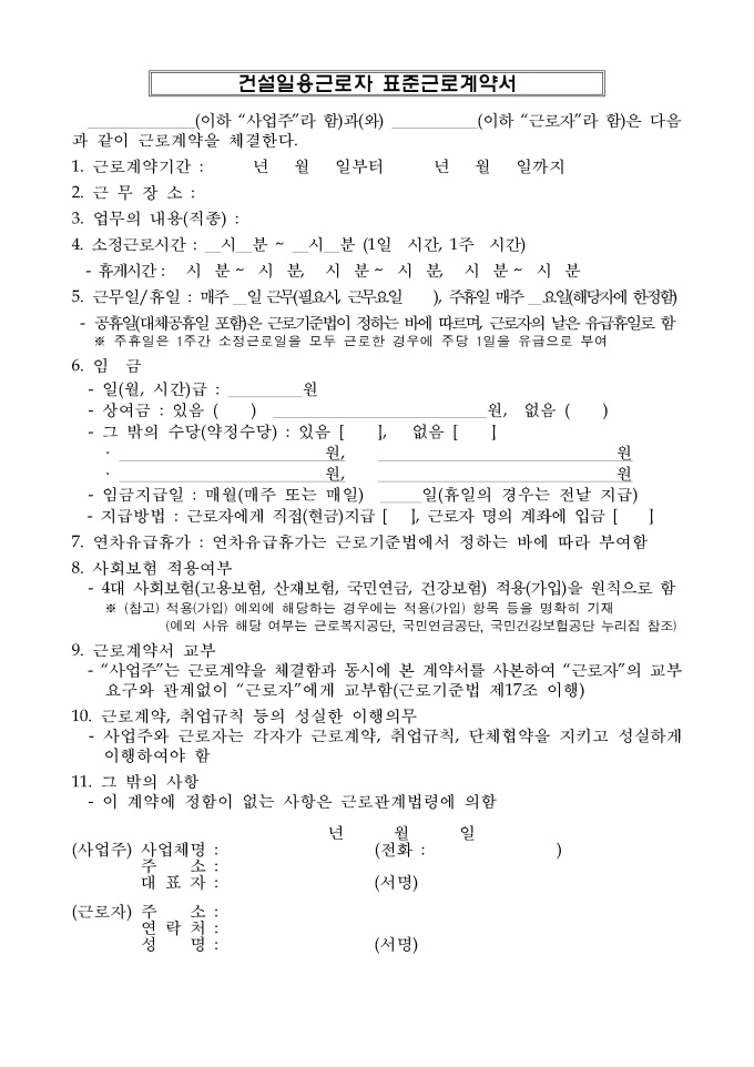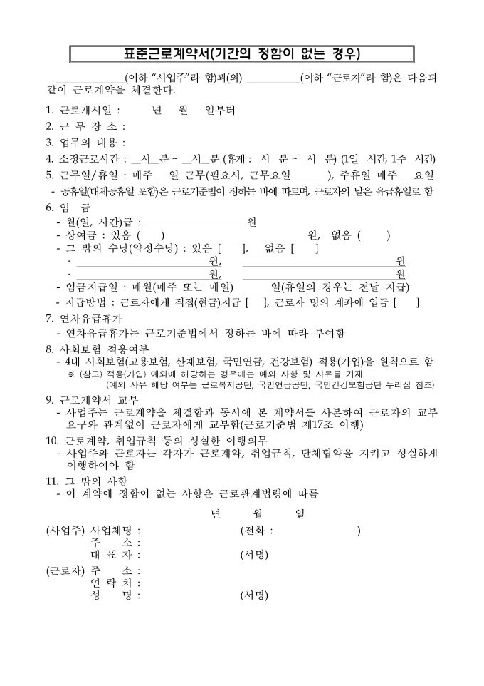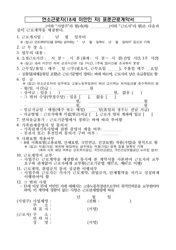 9,000원/월개정 표준근로계약서(2025년, 배포) 서식입니다. 표준근로계약서(기간의 정함이 없는 경우), 표준근로계약서(기간의 정함이 있는 경우), 연소근로자(18세 미만인 자) 표준근로계약서, 친권자(후견인) 동의서, 건설일용근로자 표준근로계약서, 단시간근로자 표준근로계약서로 구성되어 있습니다.