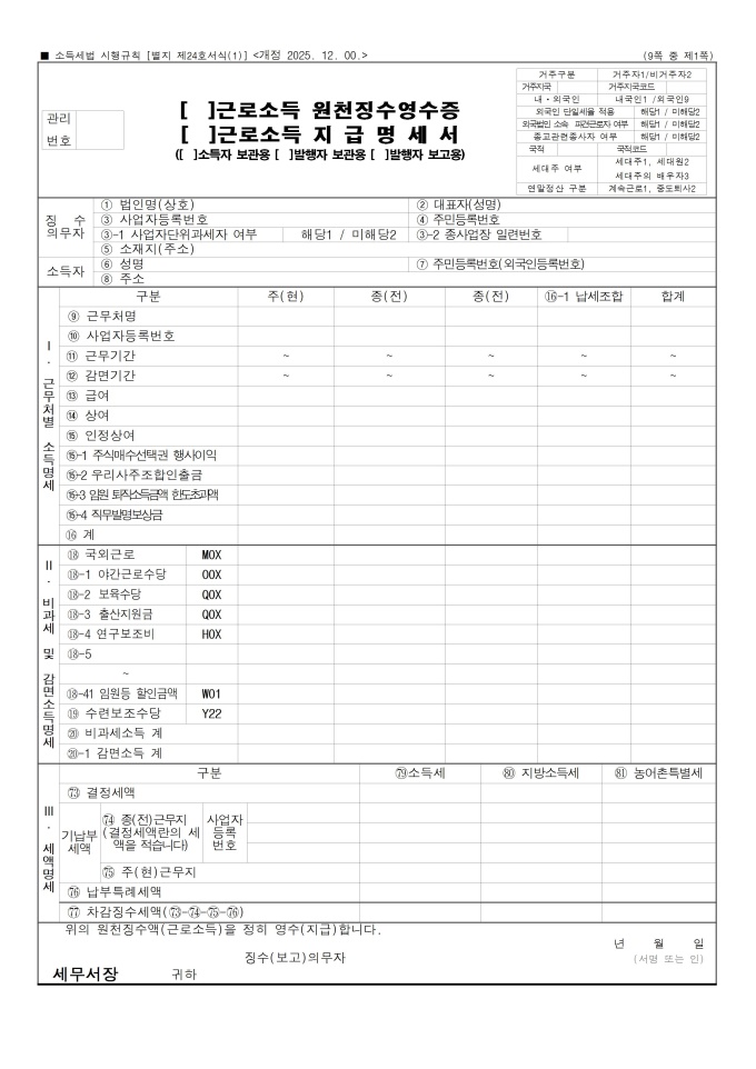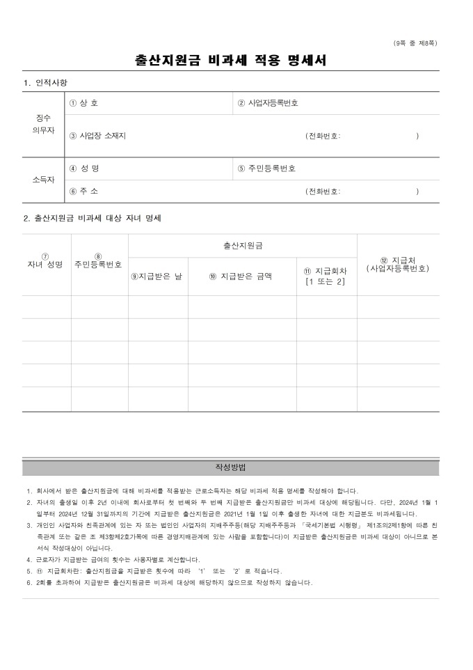 9,000원/월근로소득 원천징수영수증, 근로소득 지급명세서, 연금ㆍ저축 등 소득ㆍ세액 공제명세서, 주택임차차입금 원리금 상환액 소득ㆍ세액공제 명세서, 출산지원금 비과세 적용 명세서, 근로소득 원천징수영수증(매월분) 서식입니다.