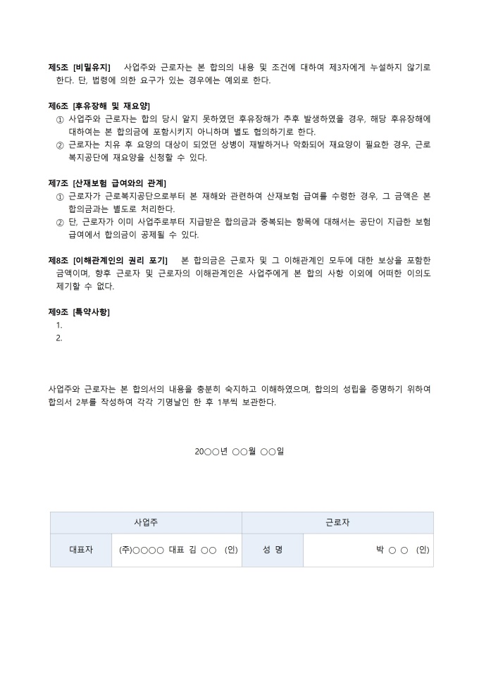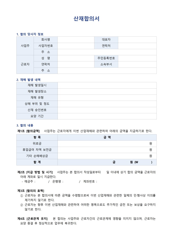 9,000원/월산재합의서 서식입니다. 산재 합의서는 산업재해로 인한 피해 보상과 관련한 민·형사 및 행정상 분쟁을 원만하게 해결하기 위해 피해 근로자와 사업주 간에 체결하는 합의 문서입니다. 근로자가 산업재해로 인해 입은 손해에 대해 사업주가 일정 금액을 지급하며, 이를 토대로 근로자가 추가적인 법적 청구를 하지 않기로 약정하는 것이 핵심 내용입니다.
