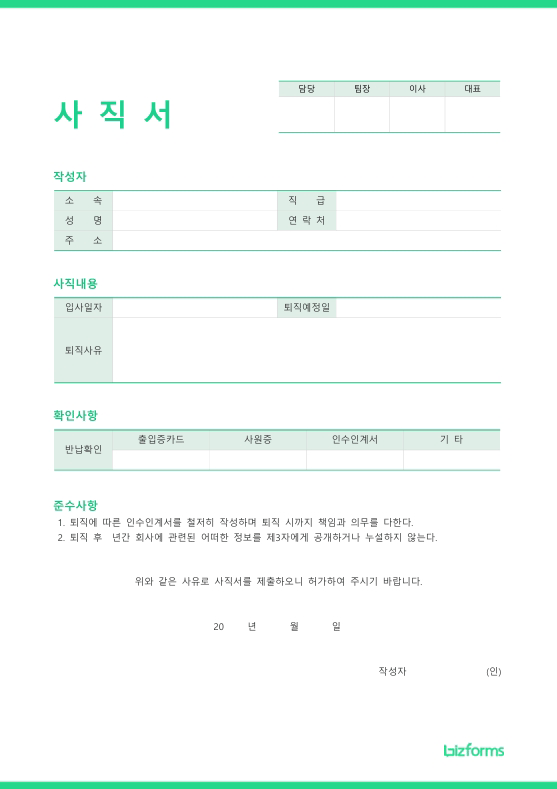 사직서 서식입니다. 사직서는 현 직장에서 자진하여 퇴직 의사를 공식적으로 밝히는 문서로 이 문서에는 사직 의사와 퇴직 예정일을 명확하게 기술함으로써 원활한 퇴직 절차를 돕습니다. 또한, 사직 이유는 간결하게 작성하는 것이 좋으며, 직장 동료와 조직에 대한 예의와 존중을 잃지 않는 표현을 사용하는 것이 중요합니다. [퇴사 패키지]는 사직서, 권고사직서, 업무 인수인계서, 퇴직금 명세서, 증명서 발급 신청서 등 퇴사 과정에 필요한 핵심 서식들을 패키지로 제공합니다. 이 패키지는 퇴사 절차의 효율성을 증대시키고, 관련 법규 준수를 지원하며, 체계적인 문서 관리를 가능하게 합니다. 이를 통해 퇴사자는 원활하게 업무를 인수인계하고 필요한 절차를 완료하며, 회사는 불필요한 분쟁 발생 가능성을 최소화할 수 있습니다. ▶ 퇴사 패키지 바로가기 (클릭)