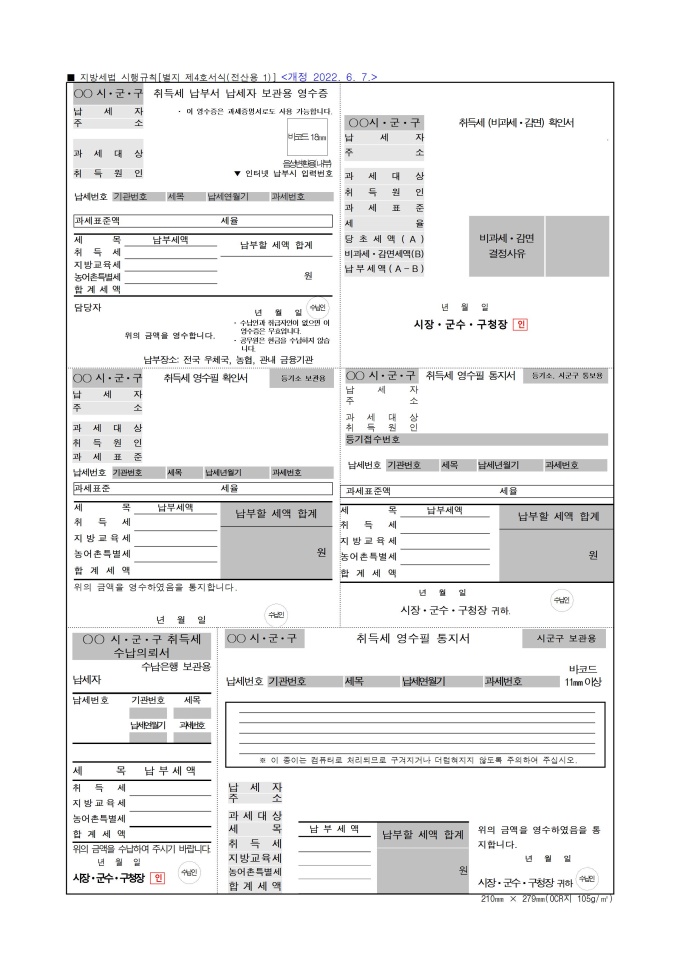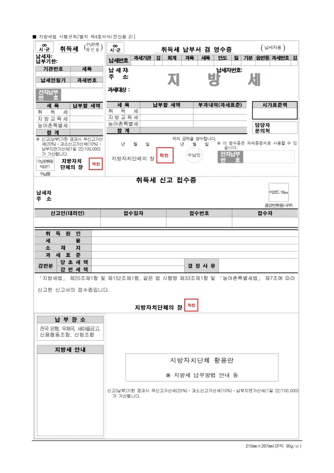 취득세 납부서 납세자 보관용 영수증 서식입니다. 지방세법 시행규칙[별지 제4호서식(전산용 1)] <개정 2022. 6. 7.>