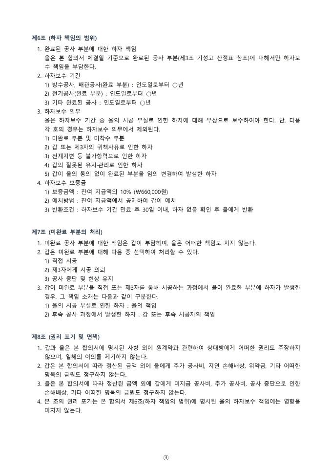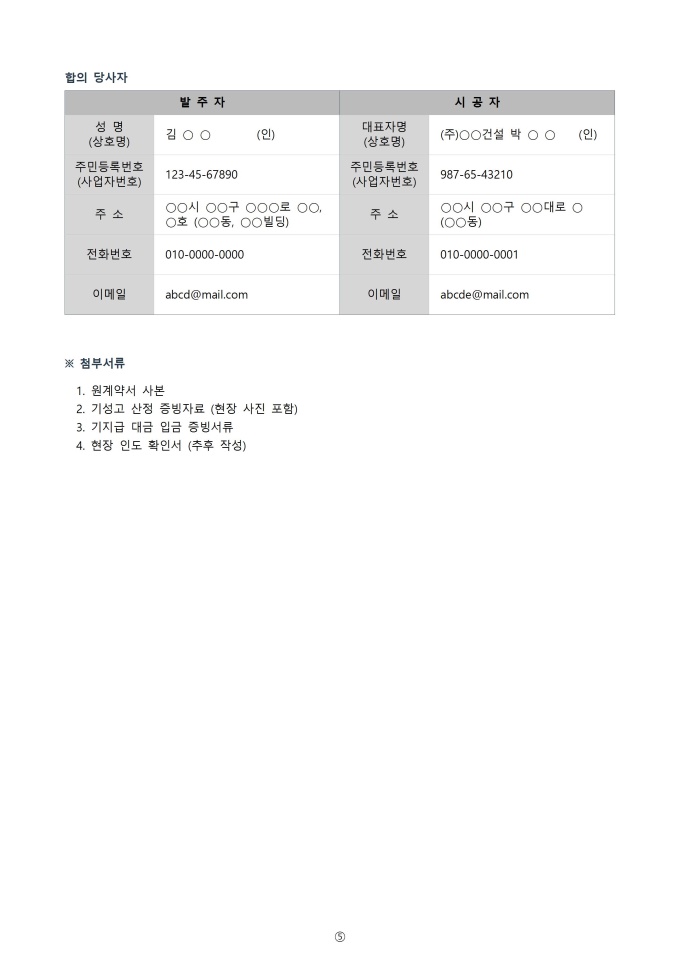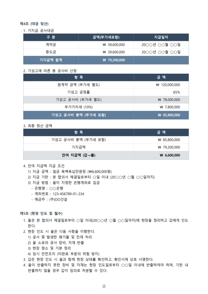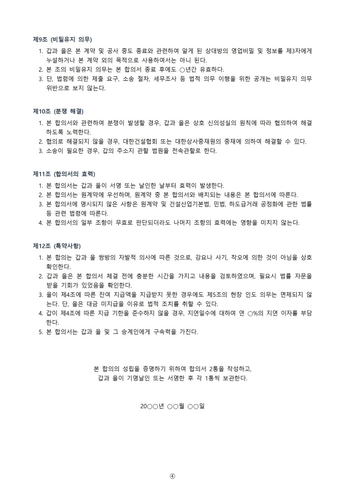 - 수급인 귀책 사유 타절 : 시공 불량, 공기 지연, 수급인 자금난 등 수급인 귀책으로 타절이 발생하는 경우 발주자는 기지급 기성금 중 미완성 부분에 대한 환수, 대체 시공비용 청구, 위약금 청구를 검토할 수 있음. 합의서에 환수 금액과 위약금 범위를 명확히 합의하여 추후 소송을 방지