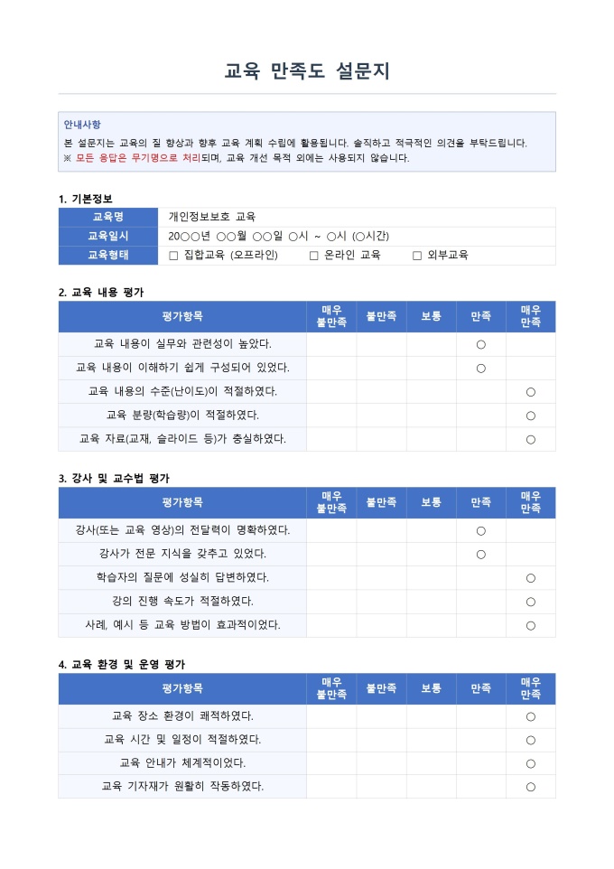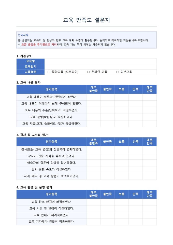 교육 만족도 설문지 서식입니다. 교육 만족도 설문지는 교육 프로그램의 효과와 참가자의 만족도를 평가하기 위해 작성하는 문서입니다. 이 설문지는 교육 내용, 강사의 전달력, 교육 장소 및 시간의 적절성, 실무 적용 가능성 등을 다각도로 점검할 수 있도록 설문 문항을 구성합니다. 설문 결과는 교육 품질을 향상시키고 개선점을 도출하는 데 중요한 기초 자료로 활용되며, 객관적이고 구체적인 피드백을 얻기 위해 질문은 명확하고 응답자가 쉽게 이해할 수 있도록 설계하는 것이 필수적입니다.