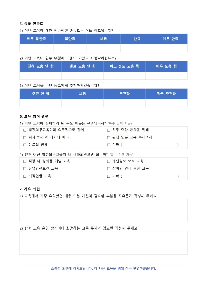 교육 만족도 설문지는 교육 종료 직후 현장에서 즉시 배포하고 수거하는 것이 가장 높은 응답률을 확보하는 방법입니다. 나중에 이메일로 발송하면 응답률이 크게 낮아지고 교육에 대한 기억이 흐려져 정확한 피드백을 받기 어렵습니다. 설문 결과를 다음 교육 기획에 실제로 반영했다는 사실을 참가자에게 공유하면 다음 교육의 설문 응답 성실도가 높아지는 선순환이 형성됩니다.