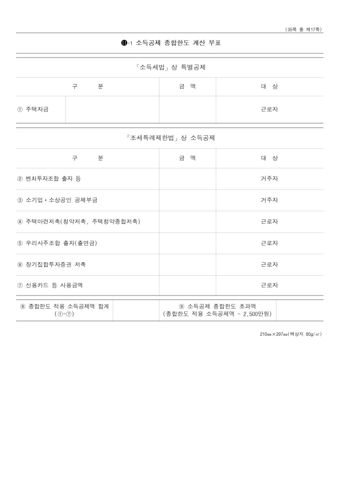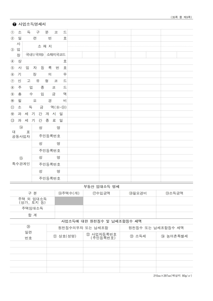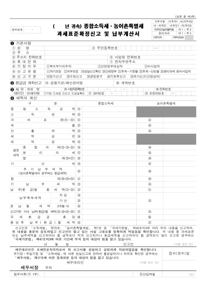 종합소득세ㆍ농어촌특별세 과세표준확정신고 및 납부계산서, 종합소득세 과세표준확정신고 및 납부계산서 (단일소득-단순경비율적용대상자용)(연금ㆍ기타소득 함께 있는 경우 포함), 종합소득세 과세표준확정신고 및 납부계산서(단일소득-종교인소득자용), 종합소득세 과세표준확정신고 및 납부계산서(분리과세 소득자용) 서식입니다. (소득세법 시행규칙)[별지 제40호서식] <개정 2026. 3. 20.>