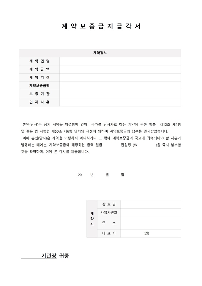 계약보증금 지급각서는 계약 당사자 일방이 계약 불이행 또는 의무 위반 시 미리 약정한 보증금을 상대방에게 즉시 지급하겠다는 의사를 공식적으로 확약하는 문서입니다.