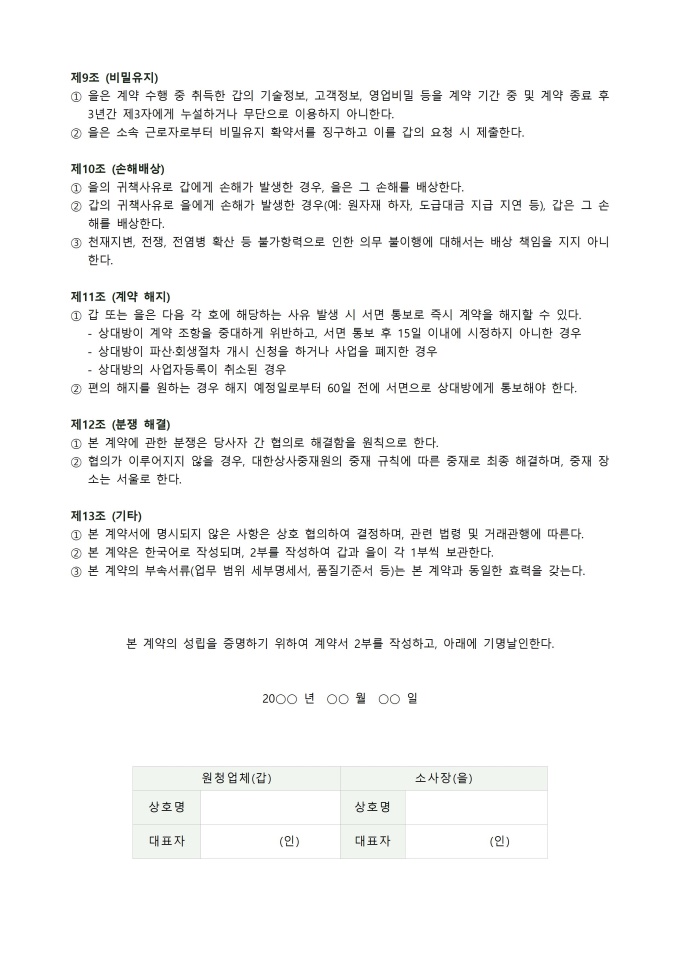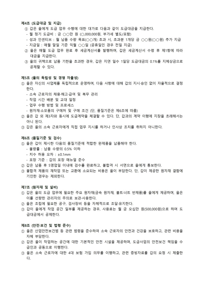 💡 작성 TIP : 소사장제 계약서는 계약서 내용과 실제 운영 방식이 반드시 일치해야 법적 효력이 유지됩니다. 계약서에 아무리 "소사장이 독립적으로 지휘·감독한다"고 기재되어 있어도 현장에서 원청 기업 관리자가 소사장 소속 근로자에게 직접 작업 지시를 하거나 출퇴근을 통제하면 불법 파견으로 판단됩니다.