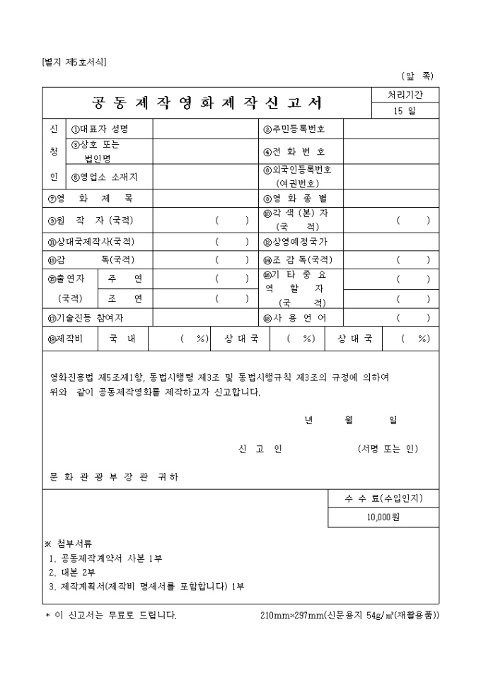 공동제작영화제작신고서(별지 제5호)
