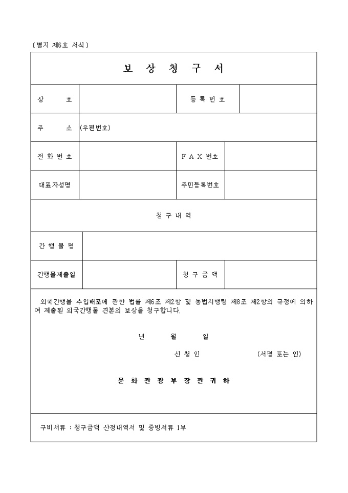 9,000원/월외국간행물 수입배포에 관한 법률 제6조 제2항 및 동법시행령 제8조 제2항의 규정에 의하여 제출된 외국간행물 견본의 보상을 청구하고자 할 때 사용하는 보상청구서 양식입니다.