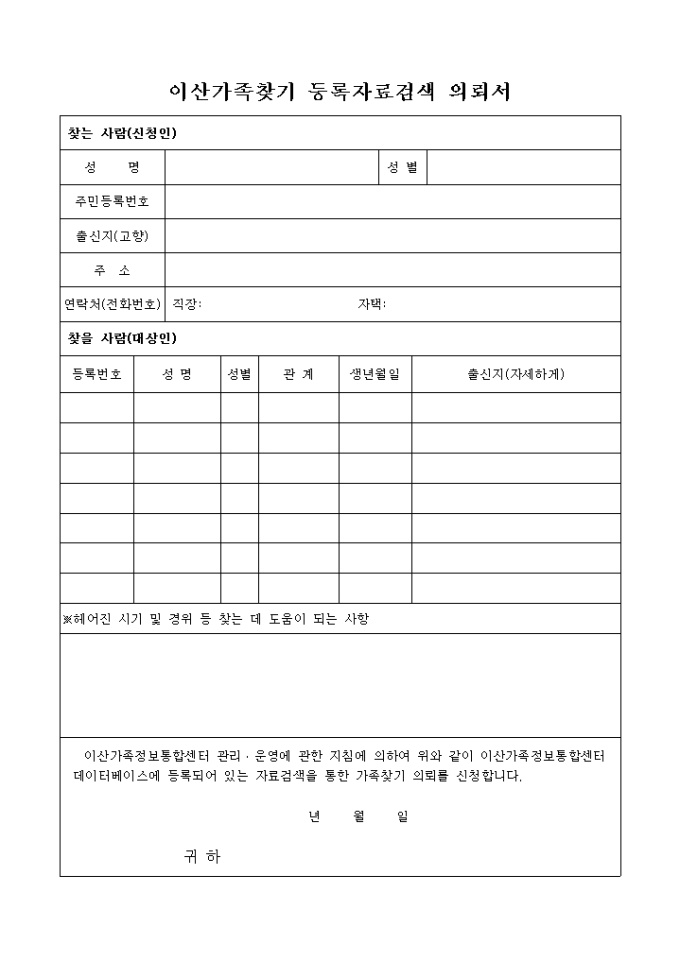 이산가족정보통합센터 관리 운영에 관한 지침에 의하여 위와 같이 이산가족정보통합센터 데이터베이스에 등록되어 있는 자료검색을 통한 가족찾기 의뢰를 신청할 때 사용하는 이산가족찾기등록자료검색의뢰서 양식입니다.