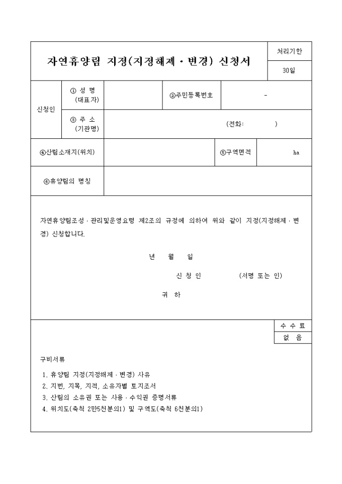 9,000원/월자연휴양림조성․관리및운영요령 제2조의 규정에 의하여 위와 같이 지정(지정해제,변경) 신청하고자 할 때 사용하는 '자연 휴양림 지정(지정해제,변경)신청서' 양식입니다.