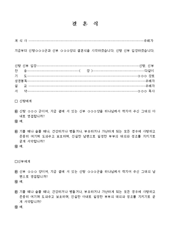 기독교에서 진행하는 결혼식 진행순서 양식입니다.
