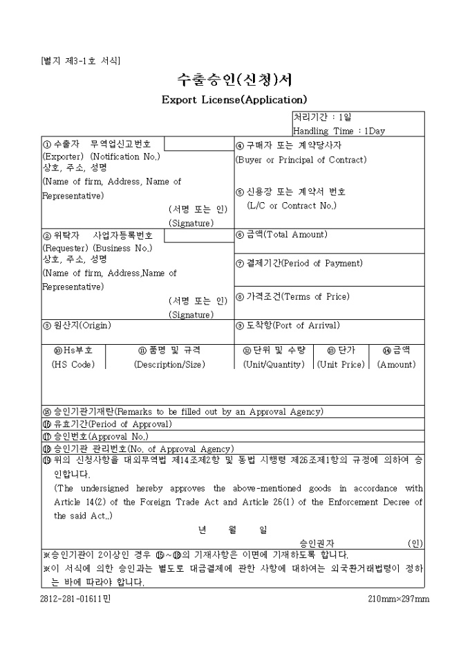 9,000원/월수출자, 무역업신고번호, 위탁자, 원산지(Origin), 구매자 또는 계약당사자, 신용장 또는 계약서 번호 등을 기록하는 수출승인(신청)서(Export License(Application)) 양식입니다.