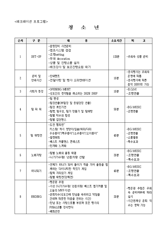 9,000원/월레크레이션 순서 및 내용, 소용시간이 기술되어 있는 레크레이션 프로그램(청소년) 진행 양식입니다.