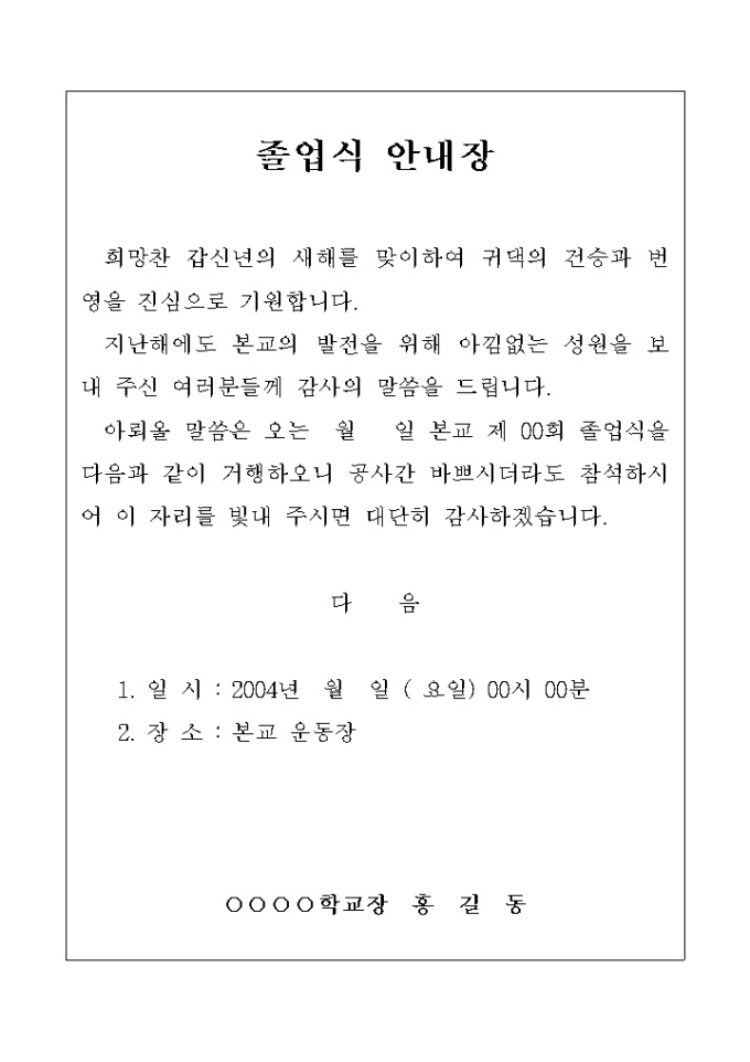 9,000원/월일시 및 장소와 함께 안내내용이 기재된 졸업식 안내장 양식입니다.