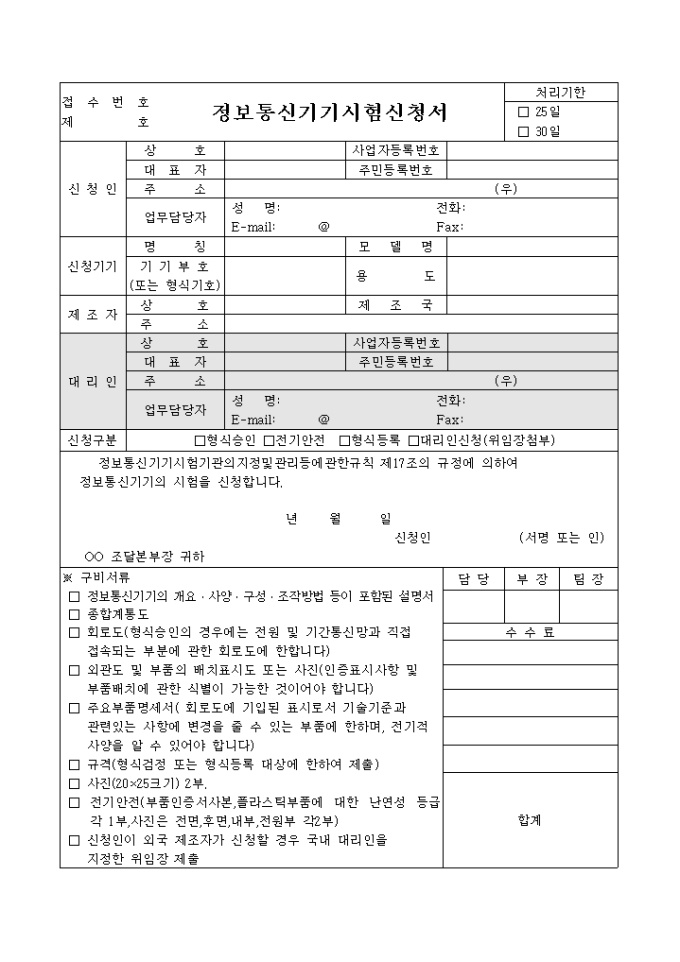 정보통신기기 시험 신청 양식입니다. 신청인의 상호, 사업자 등록번호, 주민등록번호, 주소, 신청기기의 명칭, 기기부호, 제조자의 상호, 주소, 대리인의 상호, 주소, 업무 담당자 등을 기재합니다.