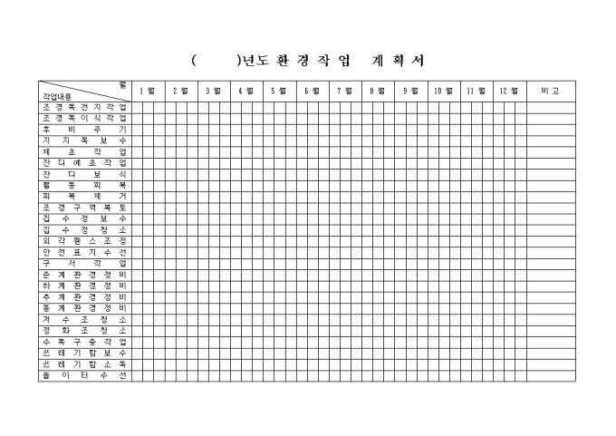 9,000원/월조경목전지작업 및 조경목이식작업, 후비주기, 지지목보수, 제초작업, 잔디예초작업, 잔디보식, 월동피복 등 작업을 계획하는 연간환경작업계획 양식입니다.