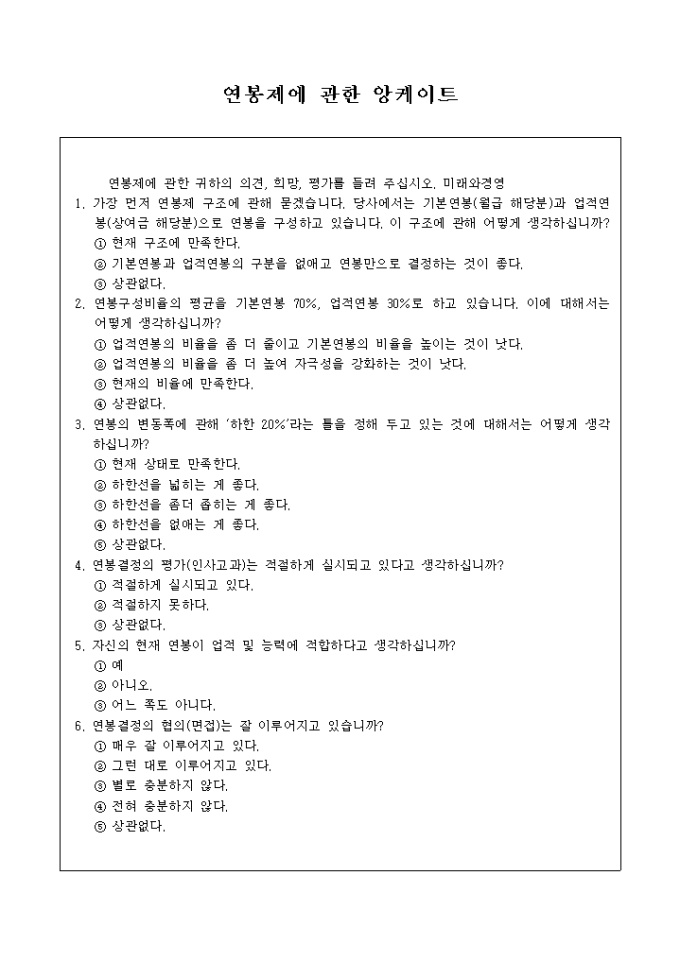 총 13개 항목으로 이루어진 연봉제에관한앙케이트입니다.