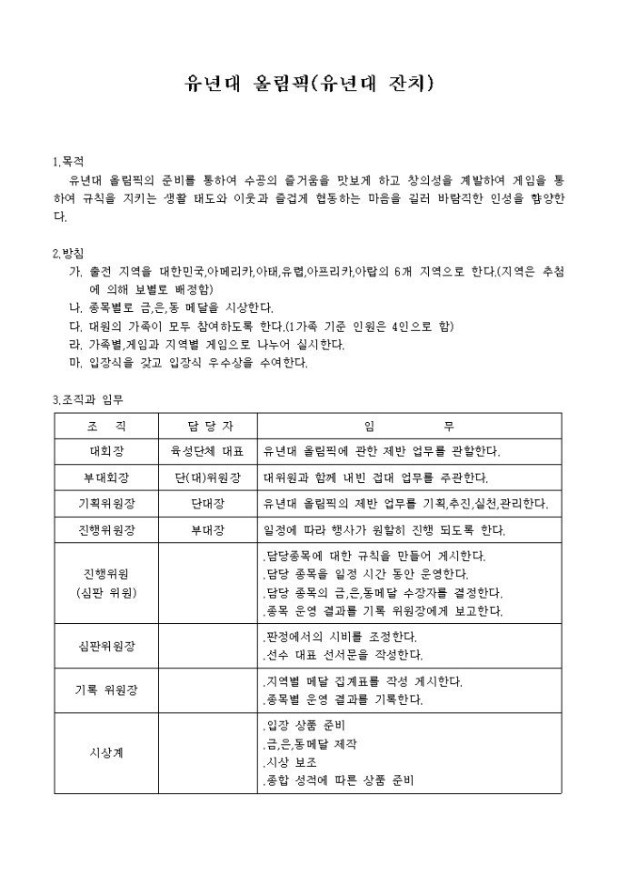 9,000원/월유년대 올림픽의 준비를 통하여 수공의 즐거움을 맛보게 하고 창의성을 계발하여 게임을 통하여 규칙을 지키는 생활 태도와 이웃과 즐겁게 협동하는 마음을 길러 바람직한 인성 햠양을 목적으로 하고 있습니다.