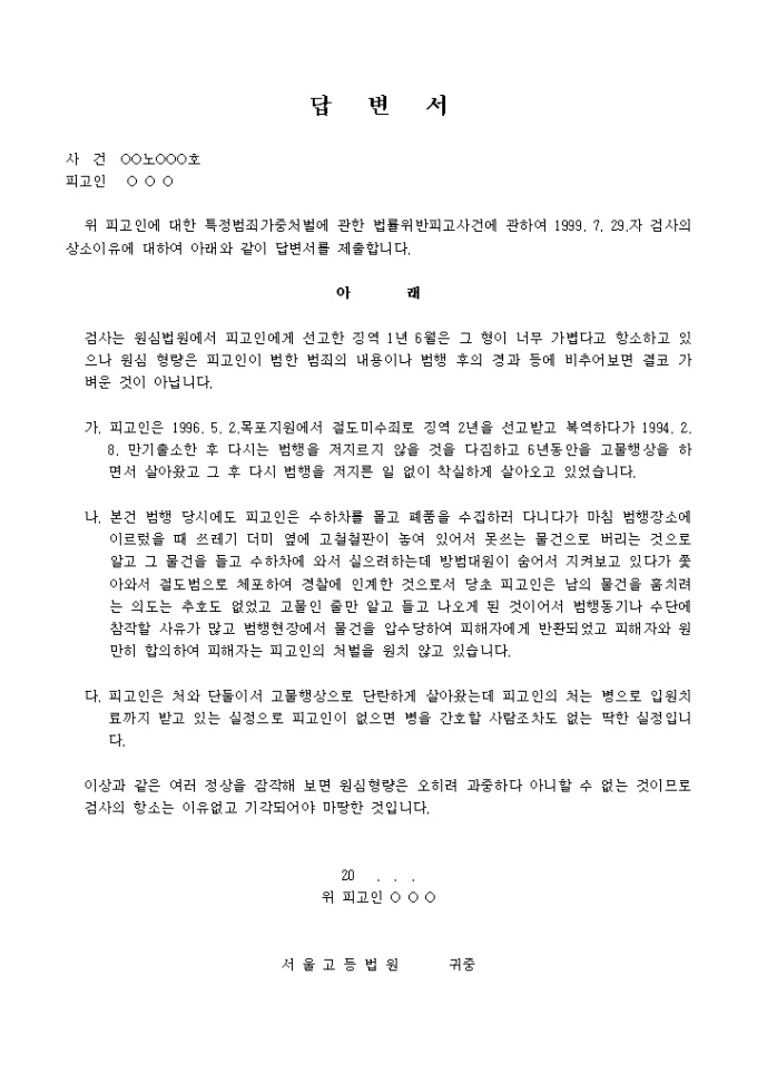 특정범죄가중처벌에 관한 법률위반피고사건에 관하여 검사의 상소이유에 대한 답변서 입니다.