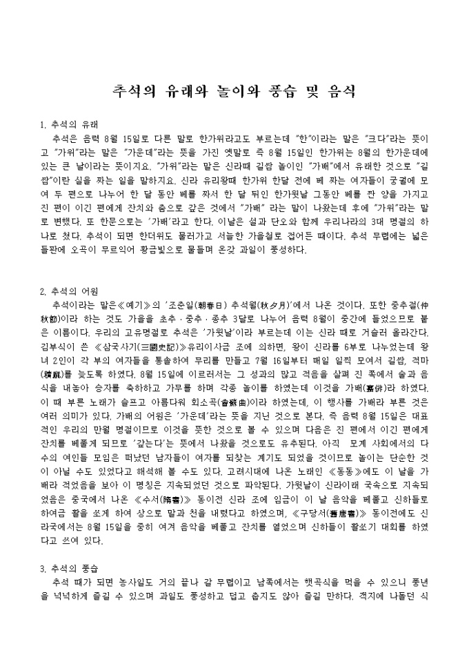 추석의 유래, 추석의 어원, 추석의 풍습, 민간 신앙적 행사, 추석날놀이(강강술래, 줄다리기), 추석날음식(오려 송편, 토란탕, 닭찜, 배숙, 햇밤, 버섯 요리, 송이 산적, 반월 송편, 화양적)으로 구성되어 있습니다.