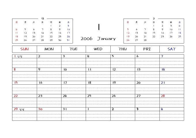2006년 달력(일별메모가로형식)입니다. 가로형식의 달력으로 각 일별에 점선이 있어 간단한 메모를 하실때 보기 좋게 기입할 수 있는 달력입니다.