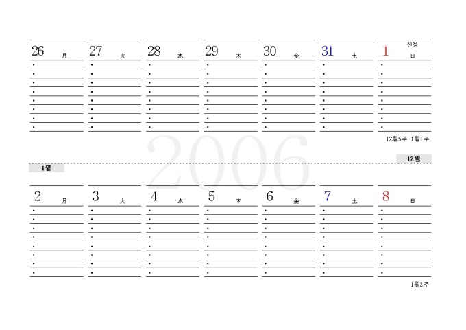 2006년 달력(주간별메모형)입니다. 일주일 단위로 메로를 할 수 있도록 만들어진 가로 서식의 달력입니다.