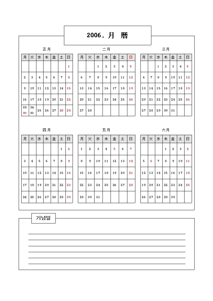 9,000원/월2006년 달력(한자)입니다. 각 달과 요일이 한자로 기입이 된 서식으로 하단에는 간단하게 기념일을 기입할 수 있도록 만들어진 달력입니다.