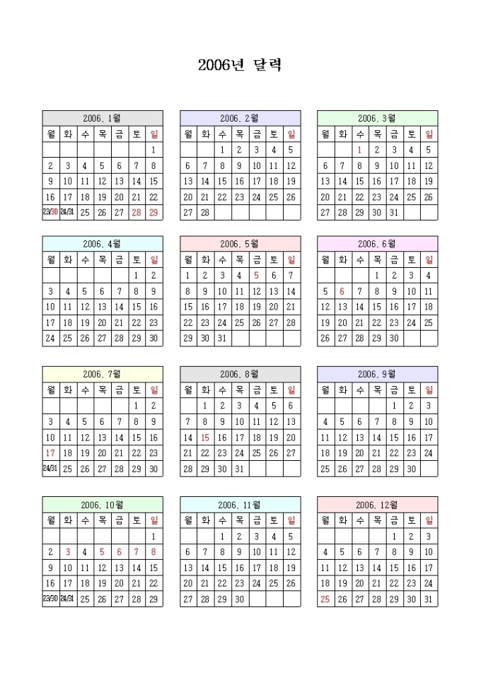 2006년 달력(휴대용)입니다. 한장에 열두달이 모두 다 들어있어 접어서 지갑속에 들고 다닐 수 있도록 만든 달력입니다.