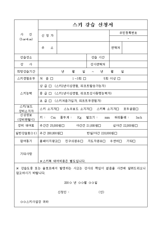 9,000원/월스키강습신청서입니다. 겨울시즌에 스키를 배우고자 하는 분들에게 필요한 서식으로 스키 강습을 배우고자 할때 쓰는 신청서 양식입니다.