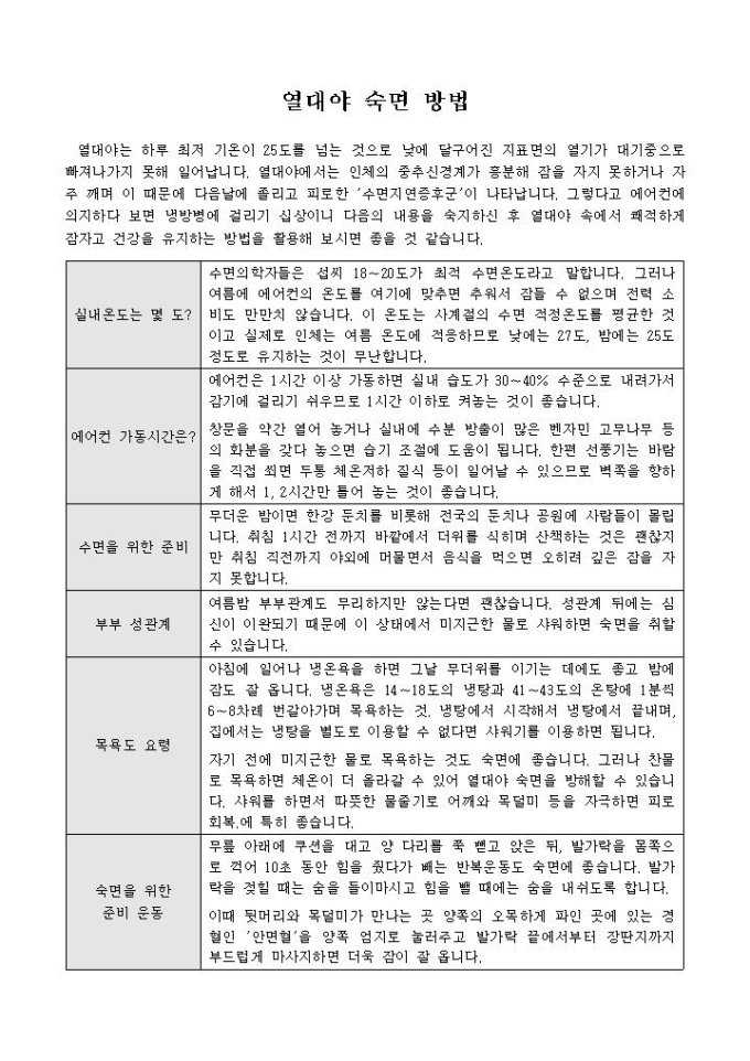 9,000원/월여름 열대야 현상 시 숙면을 취할수 있는 방법이 담겨져 있는 서식입니다.
