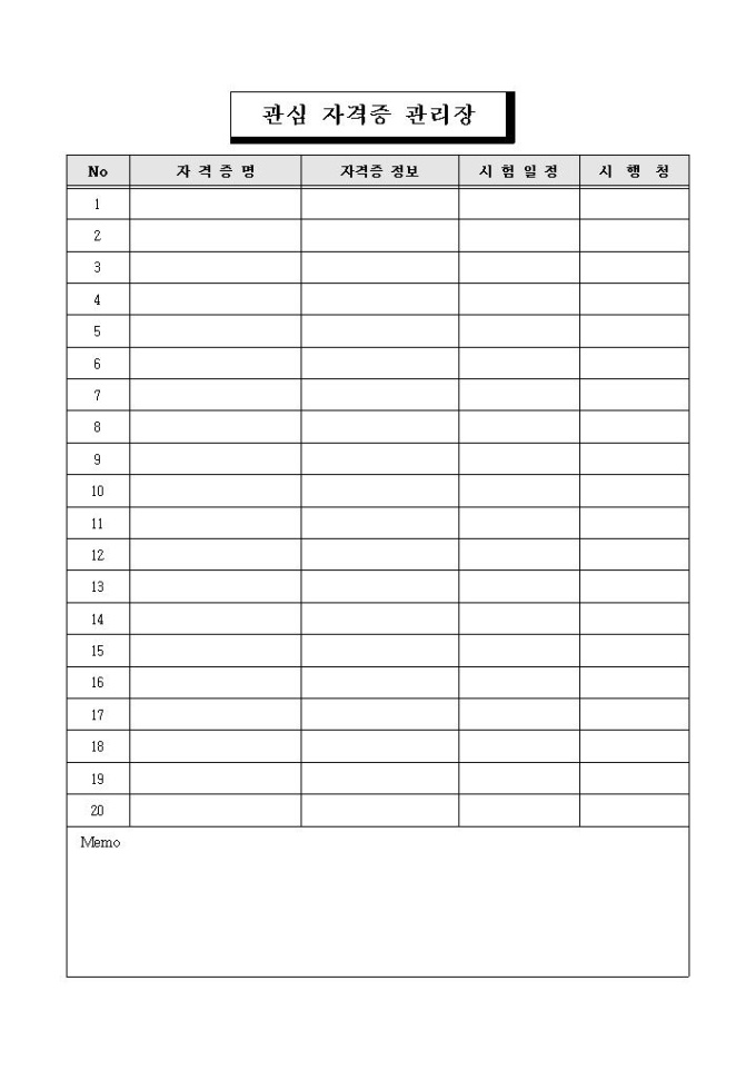취득하려는 자격증에 대한 정보를 관리할 때 사용하는 관심 자격증 관리장 양식입니다. 번호, 자격증명, 자격증 정보, 시험일정, 시행청의 항목으로 구성되어 있습니다.