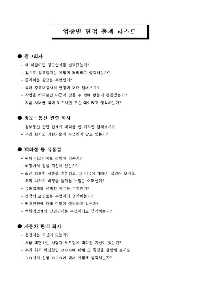 업종별 면접 출제 리스트(광고, 정보통신, 유통, 자동차)