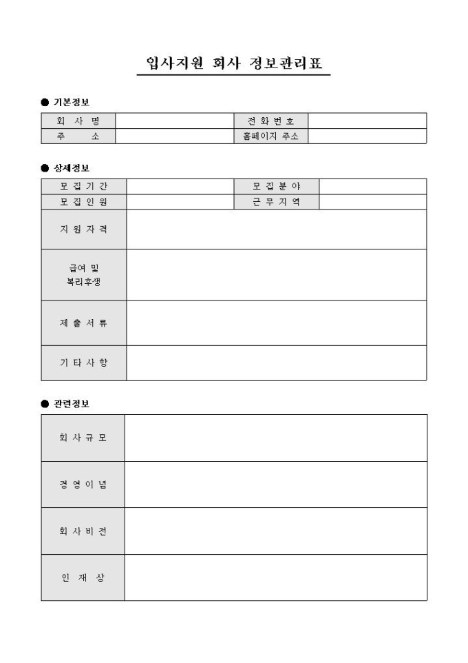 9,000원/월입사지원한 회에 대한 정보를 기록/ 관리할 수 있는 입사지원 회사 정보관리표 양식입니다. 입사지원한 회사의 기본정보, 상세정보, 관련정보로 구분하여 기록할 수 있습니다.