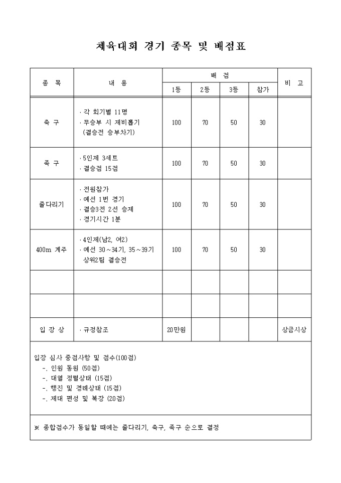 9,000원/월체육대회 시 경기 종목 별로 내용을 기록하고 배점을 할 수 있는 양식입니다. 종목, 내용, 배점, 비고 등의 항목으로 구성되어있습니다.